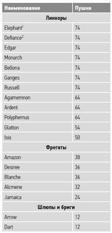 Кроме того, 90-пушечный «Лондон» (флаг Гайда Паркера), 98-пушечный «Сент-Джордж» (флагман контр-адмирала Горацио Нельсона), 74-пушечные «Сатурн», «Рамиллиес», «Уорриор», 64-пушечный «Ветеран» и 54-пушечный «Мадрас». Всего эскадра Паркера насчитывала 19 линейных кораблей, пять фрегатов, два шлюпа, два брига, семь бомбардирских судов, два брандера, одну шхуну, два куттера и два люгера.