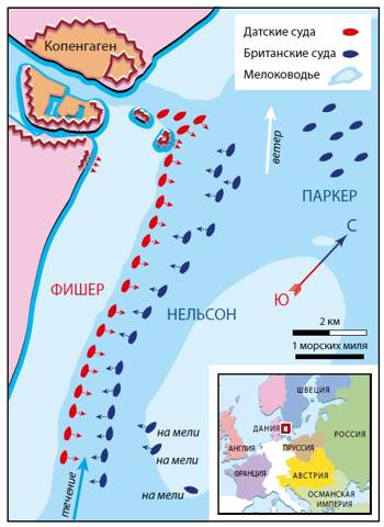 Утром 2 апреля англичане, пользуясь попутным ветром, пошли на сближение, но первая потеря британцев была не связана с действиями противника – 64-пушечный «Агамемнон» вылетел на мель. Сняться он так и не смог, и участия в сражении не принимал. Далее вою жатву собрала и отмель Миддельгрунд – там вылетели на мель 74-пушечные «Рассел» и «Беллона». Эти корабли в принципе могли стрелять по датчанам, но очень ограниченно. То есть у Нельсона осталось девять линкоров против 12.