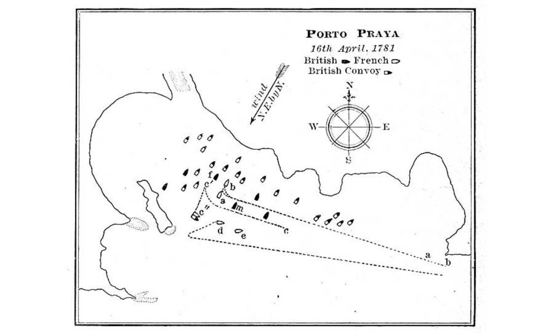 Что касается Сюффрена, то 16 апреля 1781 года он зашел в Порто-Прайя (острова Зеленого Мыса) пополнить запасы воды и обнаружил там английскую эскадру коммодора Джонсона. Англичане не были готовы к бою, они вообще стояли на якорях, французы же шли в походных колоннах, часть кораблей отстала, часть – вырвалась вперед. Состав эскадры Джонсона – 74-пушечный «Хироу», 64-пушечный «Монмут», 50-пушечные «Айсис», «Юпитер» и «Ромни», а также фрегаты 38-пушечный «Апполо», 36-пушечный «Джейсон», 32-пушечный «Эктив», 28-пушечный «Дайана», шлюп, брандер, бомбардирский кеч.