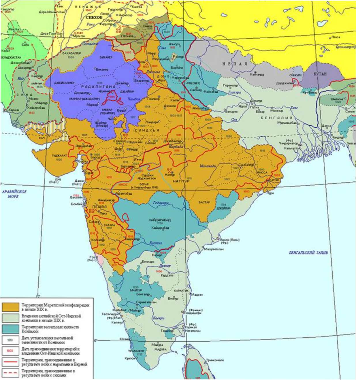 Карта Индии на начало XIX в. Оранжевым цветом выделены территории Конфедерации Маратхов.