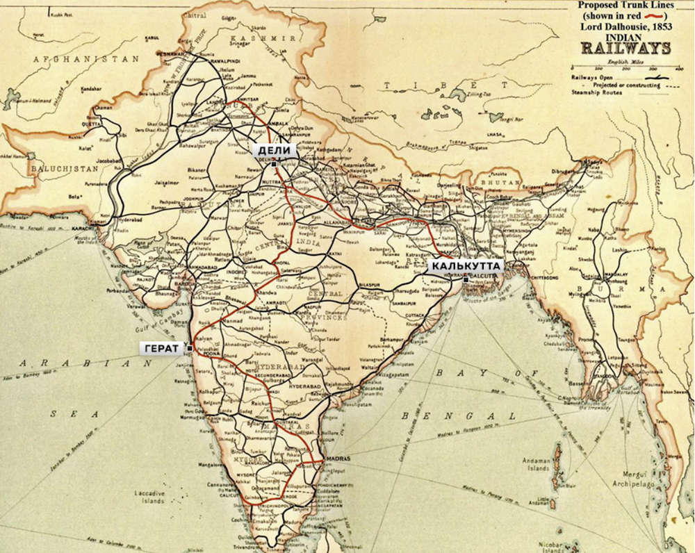 Первая железная дорога появилась в Индии в 1837 году. Рельсы соединили озеро Пушал, каменоломни на горе Сент-Томе и Мадрас. Протянули рельсы с абсолютно практической целью – привозить вырубленный камень в Мадрас, стимулировать строительство, а также доставлять пресную воду в город. Примерно по тем же причинам созданы небольшие железные дороги у Бомбея и Калькутты, где использовались в основном дрезины на мускульной силе. Первый паровоз в Индии задымил только в 1851 году, когда при строительстве канала Руки и мостов для вывоза строительного мусора, годного на переработку, протянули рельсы до Бомбея. А с 1853 года начался бум строительства железных дорог, который продолжался до 1880-х годов.