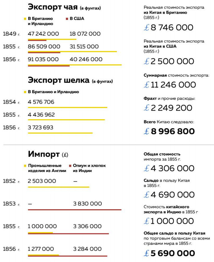 Китайское восстание не только приостановило торговлю опиумом с Индией, но также положило конец закупке иностранных промышленных изделий, поскольку китайцы настаивали на оплате своих товаров серебром, а сами прибегали к излюбленной мере восточных экономистов в периоды политических и социальных потрясений – к накоплению сокровищ. Превышение китайского экспорта над импортом стало весьма значительным еще и в связи с плохим в последнее время сбором шелковых коконов в Европе. Судя по отчетам г-на Робертсона, британского консула в Шанхае, экспорт китайского чая за последние десять лет увеличился на 63 %, а экспорт шелка на 218 %, в то время как импорт промышленных изделий уменьшился на 66 %. Г-н Робертсон оценивает сейчас среднее годовое количество серебра, ввезенного в Китай из всех частей света, на 5 580 000 ф. ст. больше, чем десять лет назад.