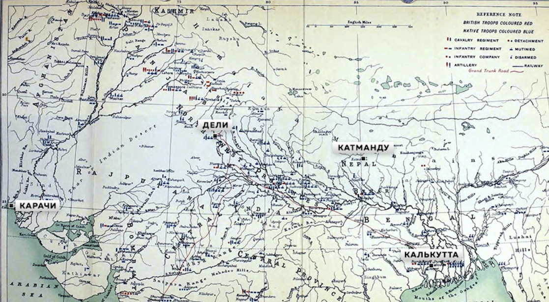 Крымская война сократила присутствие чисто британских контингентов в Индии – на 1856 год осталось всего 23 тысячи европейских солдат при 151 тысяче туземных войск.