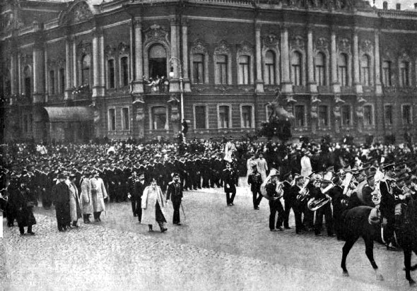 Фуллон был настолько наивен, что печатно заявил вчера во всех газетах, что «публика следовать за моряками допущена не будет», Но не успел еще второй оркестр миновать угла Знаменской, как линии казаков разом исчезли и черное, сплошное море людей захлестнуло и площадь, и Невский проспект. Кое-где, где кучками, где в одиночку, пестрели мундиры, и поток понес их и полицию, как в тисках, по течению. Авось это научит кое-чему г. Фуллона и присных его! Такого многолюдства я не запомню в Петербурге: даже «юбилейная» толпа является безделицей сравнительно с этой! Только что скрылся оркестр, напротив Знаменья какая-то кучка запела было, и притом прескверно, «Боже, царя храни», но ее затискали, не поддержали, гимн оборвался и стих в общем гуле и гомоне. Стал накрапывать дождь. Часа два после встречи на всех перекрестках Невского и на мостах творилось нечто невообразимое. Я поехал на извозчике в объезд по ул. Жуковского и Литейной в Щербаков переулок и на углу Невского должен был стоять среди моря экипажей и сплошной массы людей ровно двадцать минут.
