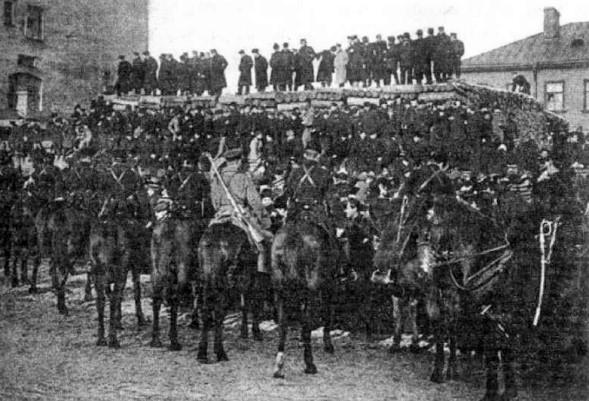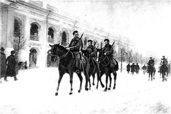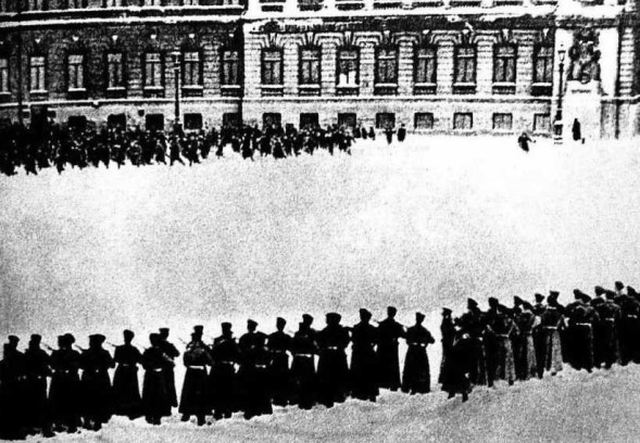 Вышел из подъезда, вижу, по Суворовскому проспекту где стоят спешившись, держа коней в поводу, где разъезжают отряды драгун в красных фуражках; перекрестки Невского охраняли пешие и конные заставы, приблизительно по взводу пехоты и по полуэскадрону кавалерии; солдатики, по случаю ветра и мороза, развели костры и выплясывали около них; во дворах по 1-й Рождественской улице стояли походные кухни. Конечно, движение по Невскому было прекращено.