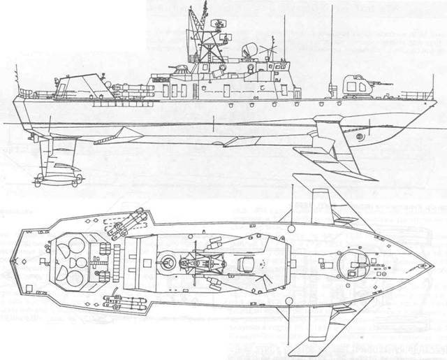 Водоизмещение полное 468,1 т, нормальное 415,1 т. стандартное 362 т; длина 49,97 м, ширина с крыльями 21,1 м, корпуса 9: 9 м, осадка с крыльями 7,27 м. Мощность ГТУ 2x1800л.с., дизелей 2x1200 л.с,; скорость полного хода 60,5 уз., экономическая 12,2 уз.; дальность плавания 1230 миль; автономность 7 суток. Вооружение: 1 ПУ ЗРК «Стрела-3» (8 ЗУР}, 1x1 76-мм АУ АК-176 и 1x6 30-мм АУ АК-630М, 2x4 224-мм ТА. Экипаж 39 человек, в том числе 5 офицеров.