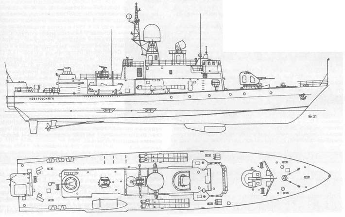 МПК-291, с 24.8.1996 – «Новороссийск» (зав № 906)*. 16.5.1990 заложен на стапеле Ярославского ССЗ для последующей продажи ВМС Ирака и 31.1.1991 зачислен в списки кораблей ВМФ, спущен на воду 23.4.1991 и вскоре отправлен по внутренним водным системам в Азовское море, а оттуда в Севастополь для прохождения сдаточных испытаний, вступил в строй 27.11.1991, после чего был законсервирован и в Стрелецкой бухте Севастополя поставлен на отстой. 25.2.1994 ввиду международных экономических санкций, введенных против Ирака, исключен из состава ВМФ и 31.8.1994 расформирован, а 24.8.1996 передан в состав Новороссийской ОБСКР, переклассифицирован в ПСКР и 12.5.1997 после расконсервации включен в боевой состав департамента морских сил ФПС. Участвует в охране границы, экономической зоны и рыболовных промыслов у Кавказского побережья РФ на Черном море.