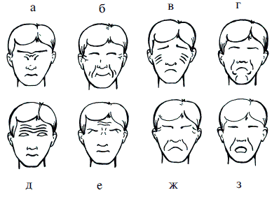 Всмотритесь в схематическое изображение лиц на рис. 1 и по некоторым деталям попробуйте в каждом случае определить эмоциональное состояние. Потом проверьте правильность своих ответов.