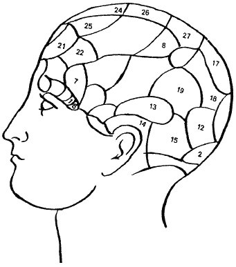 Галль и его ученики создали подробнейшие карты мозга, где указали локализацию моральных и интеллектуальных качеств человека. Поскольку всем: умом, экспансивностью, нежностью и даже любовью – заведуют строго определенные участки мозга, то их увеличение, свидетельствующее о выраженности данного качества, сопровождается появлением выпуклости в соответствующем месте на черепе. Если же в положенном месте выпуклость отсутствует, значит, способностью этой бог человека не наградил. Получалось очень удобно: потрогал череп – и человек перед тобой буквально как на ладони.