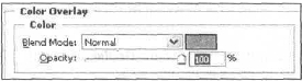 Щелкните построке Color Overlay (Наложение цвета). Этот стиль позволяет накладывать выбранный вами цвет на изображение (рис. 13.4). Все опции вам тоже известны, они похожи и по назначению. Цвет задайте по своему усмотрению.