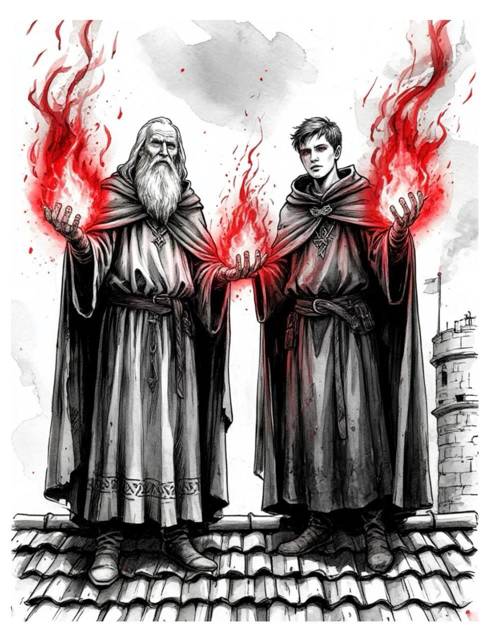 Я покрутил головой и увидел то, чему едва поверил. На крыше одного из домов стояли два человека в простых синих одеждах, покрытых мерцающими рунами. Пожилой мужчина с длинной седой бородой и молодой парень с горящими глазами. Их руки светились магическим огнем, а вокруг них потрескивала энергия.