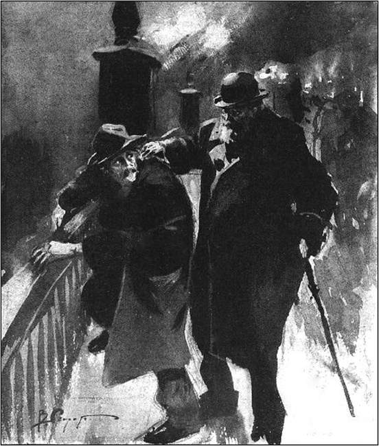 Прохожие его толкают, ворча и негодуя, что какой-то оборванец мешает им бежать и задерживает на дороге. Накрашенная девица посмотрела под его истрепанную шляпу и нагло расхохоталась. Городовой на посту повернулся и вперил тяжелый, подозрительный взгляд.
