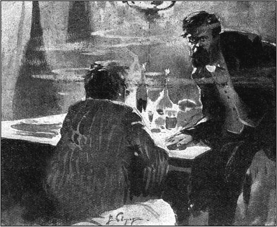 Гость давно возбуждал негодование служащего. Пришел, спросил всего один бокал пива, а сидит больше часа. Из коробочки вынул недокуренную папиросу и потихоньку сосал ее, словно старался продлить удовольствие. А теперь еще дремать начал, так и тянет его голову к столу.