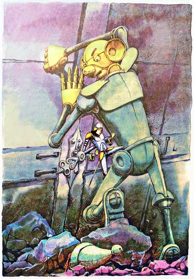 Аларм подпрыгнул и, схватившись за его ногу, медленно полез вверх. Сделать это было очень нелегко. Но, к счастью, Аларм, как и любой рудокоп, умел прекрасно лазить по скалам. Ему удалось добраться до туловища гиганта, а затем встать на краю большой пряжки его широкого металлического ремня. Вытянув руки, юноша ухватился за ключ и стал поворачивать его направо. Но, видимо, замок за долгие века заржавел и никак не хотел поддаваться.