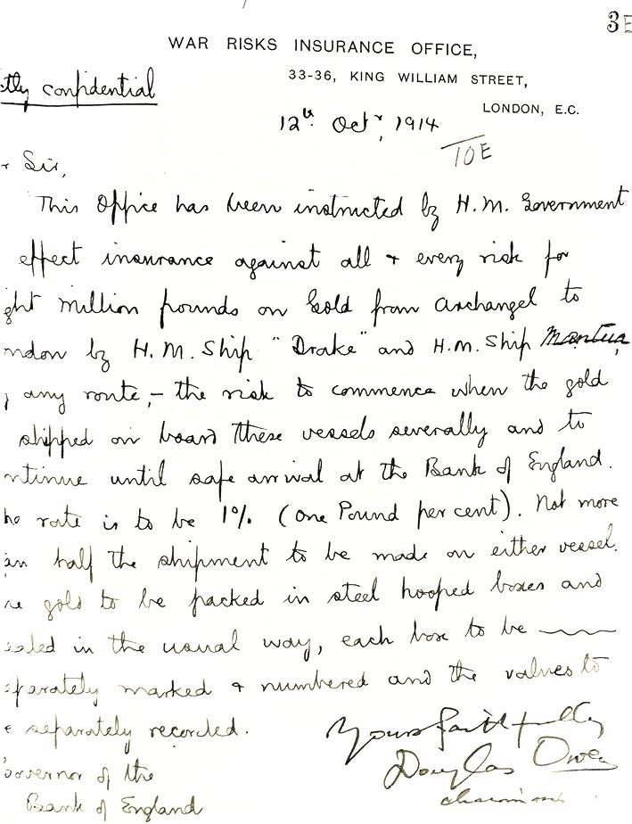 Письмо председателя Управления страхования военных рисков Дугласа Оуэна в Банк Англии о страховании доставки золота из Архангельска в Москву. 12 октября 1914. [Bank of England Archive. Russian Gold to Ottawa via Vladivostok]