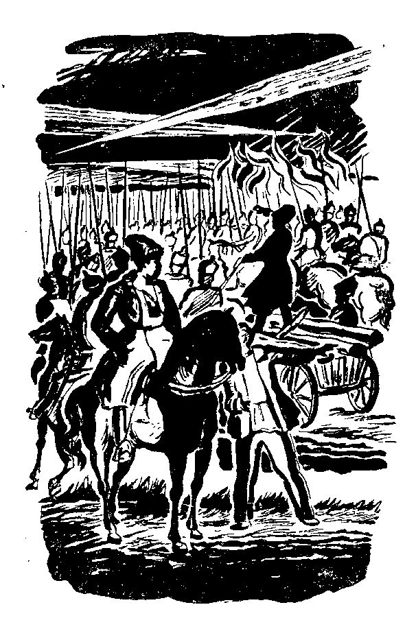 …На другом конце села расписная коляска, запряженная парой серых коней, проскочила мимо последних хат. Она увозила попа, зятя Кубаря. На облучке сидел полупьяный, покачивающийся Остап и яростно нахлестывал лошадей. Поп все время боязливо оглядывался назад, как будто ожидал погони.