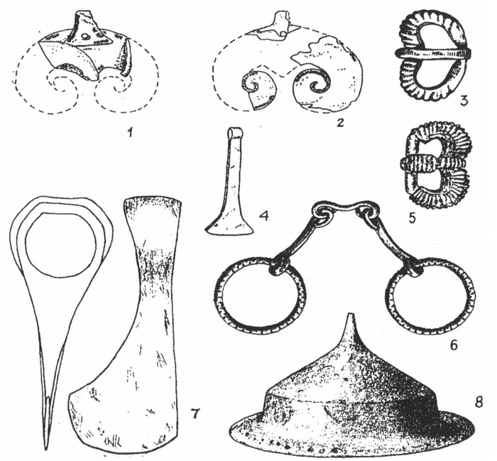 Рис. 33. Предметы среднеевропейского провинциальноримского происхождения из памятников северной части Восточно-Европейской равнины: 1, 2 – пельтовидные привески; 3, 5 – В-образные рифленые пряжки; 4 – пинцет; 6 – удила; 7 – боевой топор; 8 – умбон. 1, 2, 4, 5 – Любахин; 3 – Полибино; 6, 8 – Доложское; 7 – Чагода