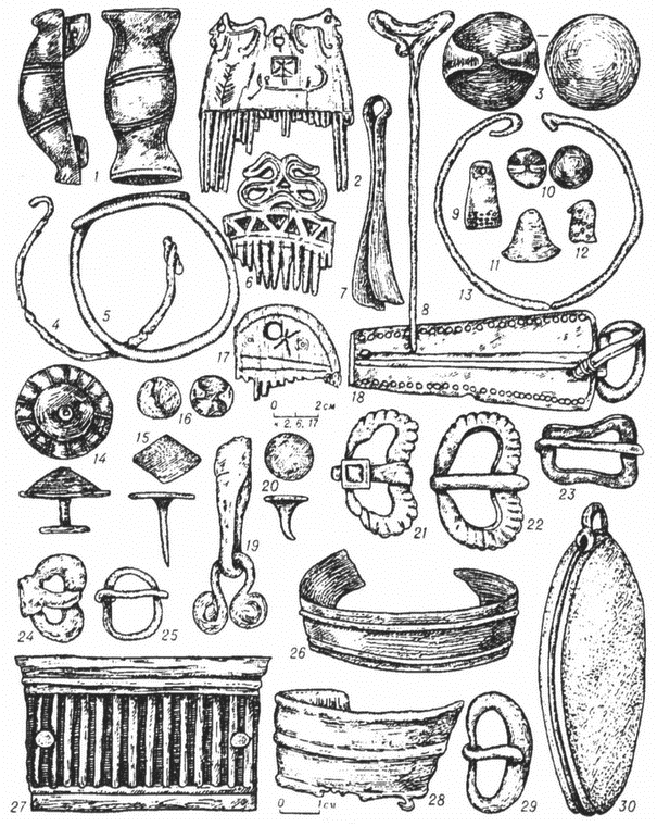 1 – равноплечная фибула; 2, 6, 17– гребни; 3, 10, 14—16, 20 – бляшки; 4, 5, 13 – височные кольца; 7 – пинцет; 8 – булавка; 9, 11, 12, 19– привески; 18, 21—25, 29 – пряжки; 26, 28 – браслеты; 27 – накладка; 30 – блоковидное кресало. 1, 3—5, 7—16, 18—29 – металл; 2,6,7 – кость; 30 – камень.