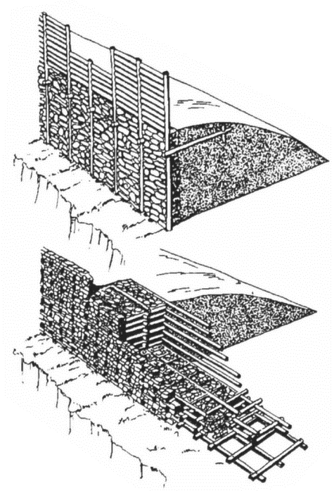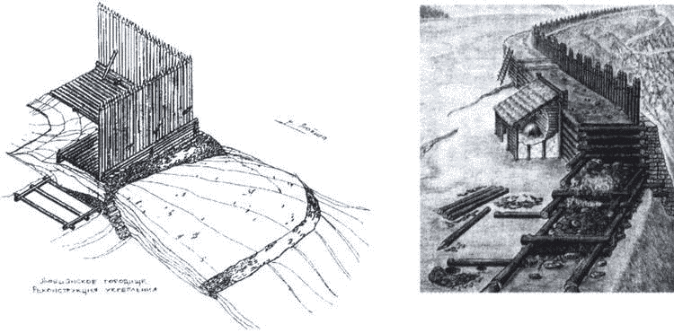[Закрыть]. А вот описание конструкции любшанской крепости, сделанное археологом Е. А. Рябининым: «Внутренняя часть ее вала была сооружена из каркасных деревянных конструкций, засыпанных глиной и утрамбованных. На валах стояли внушительные деревянные сооружения. С наружной стороны вал был обнесен подпорной стенкой из колотой известняковой плиты» [151]151
