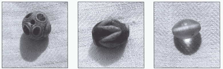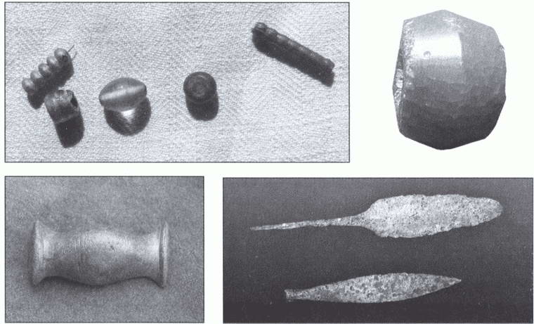 Рис. 41. Изборск, Труворово городище (стеклянные и янтарные бусины, фибула, наконечники стрел и дротиков)