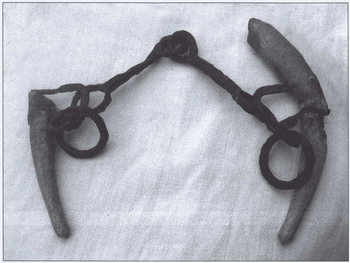 Немало интересных международных связей показывают и находки оружия. Из Северной и Центральной Европы происходят некоторые изборские наконечники копий. Ланцетовидные втульчатые наконечники, слегка суживающиеся у шейки и плавно переходящие во втулку, появились в Центральной и Северной Европе в VI—VIII веках и получили наибольшее распространение в IX—X веках. В нижних слоях Изборского городища найдены также очень интересные удила с довольно крупными, дугообразно изогнутыми роговыми псалиями (рис. 42). Похожие удила с псалиями встречены в знаменитых княжеско-дружинных курганах X века Чернигова (Черная могила и Гульбище) и в Гнездовском могильнике. Псалии подобных удил обычно украшались нарезной орнаментацией – растительными и геометрическими узорами. Одни из изборских псалий имеют поперечные нарезки с циркульным орнаментом, другие богато украшены плетеночными узорами [164]164
