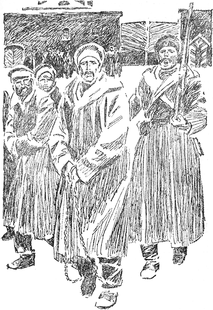 Кандалы, хотя и выложенные изнутри полосками грубой кожи, больно давили своей тяжестью. Кольца, охватившие ноги, оказались несоразмерно велики, сильно спадали вниз и терли щиколотки при каждом шаге. Дубровинский пытался их подтягивать цепью, соединявшей с ручными оковами, но быстро немели пальцы, и цепь выскальзывала. Он не знал, как к ним приспособиться на ходу, – в этапе только он и еще кто-то из уголовных оказались закованными, а конвойные подталкивали, торопили: «Не отставать!»