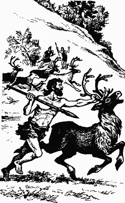 Площадка покачнулась и с треском рухнула вниз. Но стадо уже не могло остановиться. Задние продолжали напирать. Матки и оленята кучами валились с обрыва. На самом краю олени вскакивали на дыбы и пытались повернуть назад, но напиравшие сзади сбивали их вниз и сами валились за ними. Под обрывом лежали известковые глыбы. Олени падали на них, разбивались насмерть или калечили ноги. Самцы, остановленные давкой, вдруг повернули назад и в отчаянии ринулись обратно. Охотничьи копья не задержали их. Они опрокидывали людей, перепрыгивали через них и мчались дальше. Уцелевшие матки и оленята бросились за ними. В несколько мгновений загон опустел. Вырвавшись из него, рогачи летели по кустам и кочкам. Ушибленные и опрокинутые люди со стоном поднимались с земли.
