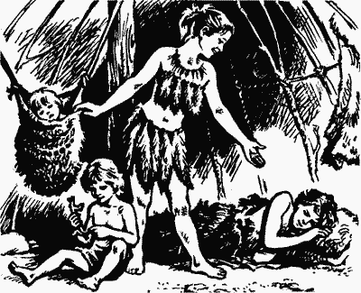 Как и все матери, она в землянке ходила почти без одежды. Только длинная бахрома из лисьих, песцовых и волчьих хвостов, подвешенных к меховому поясу, составляла что-то вроде короткой юбки вокруг ее стана. Другая такая же бахрома из хвостиков полевок, водяных крыс и мышей охватывала ее шею.