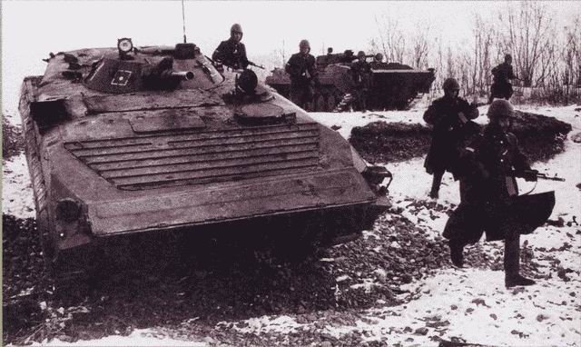 Атака мотострелкового подразделения при поддержке БМП-1. На этой фотографии хорошо видна верхняя передняя часть корпуса БМП-1 над МТО (АСКМ).