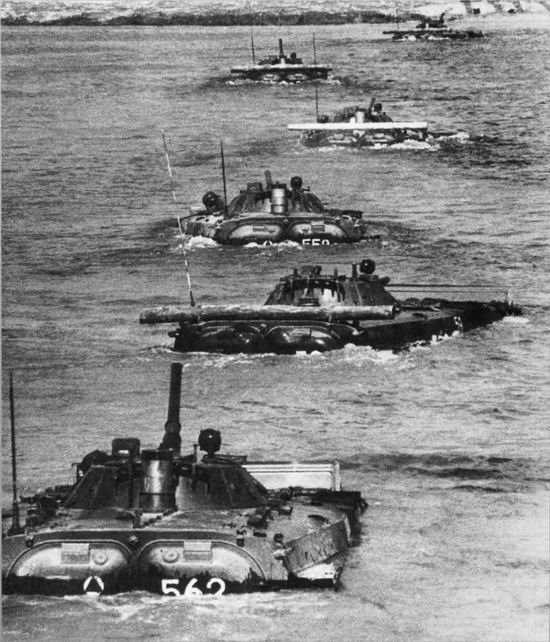 Преодоление БМП-1 водной преграды вплавь. 1987 год. На фотографии видно, что на второй снизу БМП-1 воздухопитающая труба полностью не поднялась (ИТАР-ТАСС).