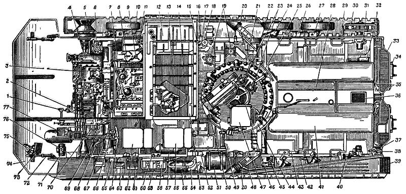1 – рукоятка ручной подачи топлива, 2 – гидроцилиндр, 3 – коробка передач, 4 – остановочный тормоз, 5 – ведущее колесо, 6 – носовой водооткачивающий насос, 7 – двигатель УТД-20, 6 – расширительный бачок системы охлаждения, 9 – пробка для заливки охлаждающей жидкости, 10 – масляный бак системы смазки двигателя, 11 – пробка заправочной горловины масляного бака, 12 – эжектор, 13 – масляный радиатор системы смазки двигателя, 14 – водяной радиатор, 15 – перегородка силового отделения» 16 – трубопровод откачки воды из силового отделения, 17 – рукоятка крышки лючка выброса газов из котла подогревателя, 18 – баллоны системы ППО, 19,23 – ПТУ PC в укладке, 20 – шаровая опора для установки пулемета ПК, 21 – выстрел ПГ-15В в конвейере, 22 – опорный каток, 24 – балансир, 25 – ограждение конвейера, 26 – гидроамортизатор, 27 – упор, 28 – топливный бак, 29 – очиститель направляющего колеса, 30 – направляющее колесо, 31 – механизм натяжения гусеницы, 32 – водооткачивающий насос и насос ТДА, 33 – кормовая дверь, 34 – запасной трак, 35 – рукоятки замка правой двери, 36 – отопитель кормового отделения, 37 – уплотнение кормовой двери, 38 – ручной углекислотный огнетушитель ОУ-2, 39 – направляющий аппарат, 40 – шаровая опора для установки автомата, 41 – сиденье десанта, 42 – рукоятка крышки амбразуры, 43 – кронштейн крепления автомата по-походному, 44 – вращающийся пол боевого отделения, 45 – вентилятор отсоса пороховых газов из машины, 46 – вращающееся контактное устройство (ВКУ-330-1), 47 – сиденье оператора, 48 – трубопровод отсоса пороховых газов, 49 – механизм поворота башни, 50 – гильзозвеньесборник, 51 – фильтр ФПТ-200М, 52 – датчик ПРХР, 53 – масляный радиатор коробки передач и ПМП, 54 – клапанная коробка ФВУ, 55 – нагнетатель, 56 – сиденье командира, 57 – баллон со сжатым воздухом, 58 – радиостанция Р– 123М, 59 – трубопровод раздачи воздуха, 60 – аппарат ТПУ № 1, 61 – блок питания радиостанции, 62 – сиденье механика-водителя, 63 – измерительный пульт ПРХР, 64 – штурвал, 65 – коробка управления обогревом ВЗУ, 66 – рычаг включения замедленных передач, 67 – рычаг переключения передач, 68 – педаль управления главным фрикционом, 69 – педаль управления остановочными тормозами, 70 – педаль управления подачей топлива, 71 – преобразователь гирополукомпаса, 72 – пневмопривод подъема волноотражательного щитка, 73 – фильтр Ф-1, 74 – нижний наклонный лист, 75 – звуковой сигнал, 76 – блок питания ПРХР, 77 – коробка релейная КР-65.