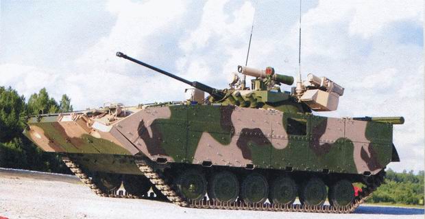 Одна из последних версий модернизации БМП-2, предлагаемая ОАО «Курганмашзавод». На машине установлены современная автоматизированная СУО, спаренная пусковая установка ПТУР «Атака», противокумулятивные решетчатые экраны (фото Сергея Суворова).