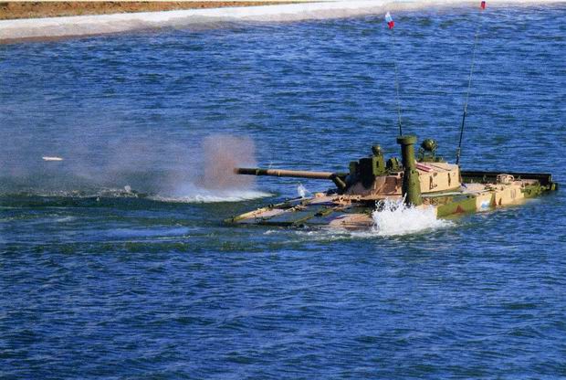 Находясь на плаву БМП-3 «спокойно» может вести огонь на любой борт, а не только вдоль продольной оси, как это могут делать зарубежные аналоги (фото КМЗ).