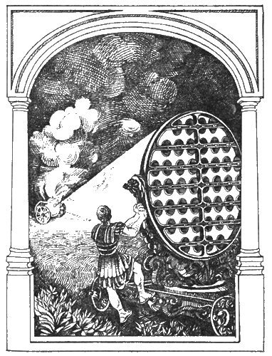 По просьбе Архимеда круглое вогнутое зеркало перенесли на площадку и повернули к солнцу. Появившийся Гекатей начал вносить в фокус зеркала различные предметы, демонстрируя действие солнечного жара. Загорались деревянные палочки и клочки папируса, плавился свинец, был прожжен насквозь тонкий лист меди.