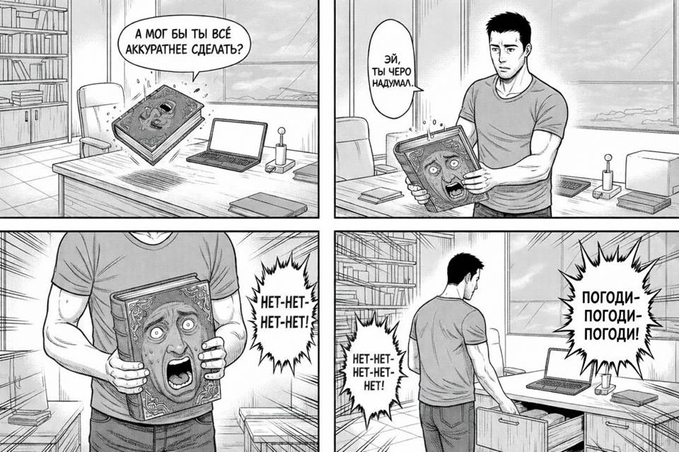 – Нет-нет-нет-нет… – затараторила книга, понимая вектор моего движения. – Погоди-погоди-погоди! Мы же просто общаемся! Конструктивный диалог!