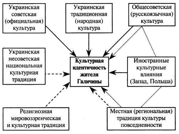 [Закрыть], увидим: для Галичины ведущими факторами, определяющими идентичность ее жителей, издавна были не только «мейнстрим» украинской национальной культуры (причем в эпоху СССР – как советской, так и противостоящей ей «несоветской»), но также и своеобразная региональная культура, и религиозная (грекокатолическая) традиция, и значительное зарубежное культурное влияние, причем не только опосредованное (через российское и «центральноукраинское» «отфильтровывание», перевод, адаптацию), но и прямое (см. схему 1[499]499