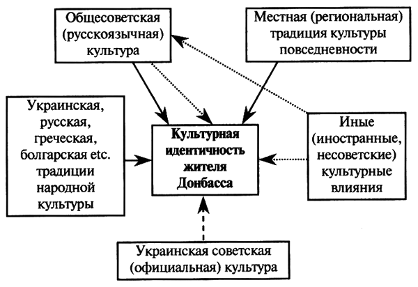 А в формировании культурных идентичностей жителей Донбасса явно доминировали «общесоветская» русскоязычная культура, а также своеобразная региональная культура повседневности. Влияние украинской культуры (даже в советском ее варианте) было тут на порядок слабее, «несоветской» же – практически не было; то же самое можно сказать и о религиозной традиции и об иностранных культурных влияниях (см. схему 2). Влияние же украинского села с его традиционной культурой было в этом старопромышленном крае, пожалуй, самым слабым изо всех регионов Украины, а пласт советского культурного наследия – самым мощным, доминантным.