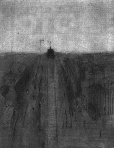 Лунной ночью паровоз мчится по железной дороге в глуши, проезжает будку станционного смотрителя, оглашает окрестность свистом, из трубы вырывается черно-желтый дым. Бурлюк рисует эту картину в мрачных тонах, как предвестье опасности.