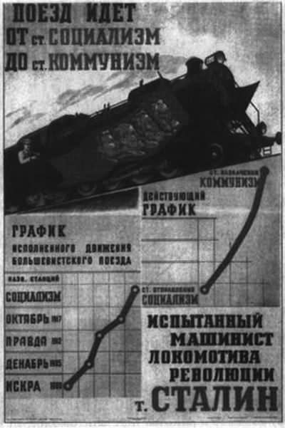 Когда завершается НЭП, у локомотива истории появляется машинист Сталин, ведущий состав к победе коммунизма (1928; илл. 4). Образ стремительной экспансии революции неизбежно возникает на первых страницах производственного романа В. Катаева «Время, вперед!» (1932):