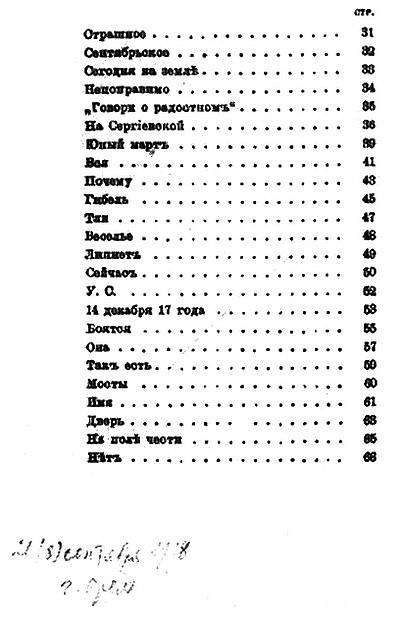 Оглавление сборника З. Гиппиус с автографом Л. Тинякова: «21 (8) сентября 1918 / г. Орел».