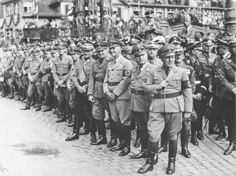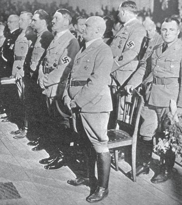Мартин Борман (первый справа во втором ряду), Адольф Гитлер (в первом ряду второй) на одном из сборищ нацистов. 1937 год