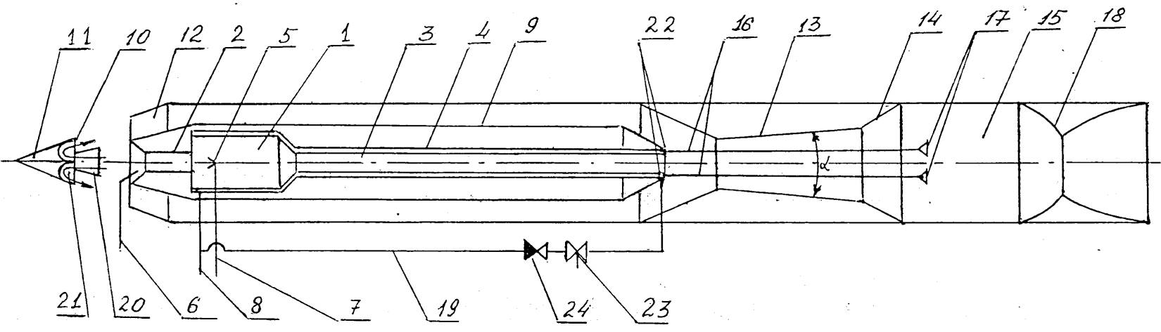 Применение эжектора с конической камерой смешения по сравнению с цилиндрической позволяет наиболее эффективно использовать энергию пульсирующего потока из резонансной трубы за счет увеличения количества подсасываемого воздуха через эжектор при нулевой скорости набегающего потока, что позволяет подавать в камеру дожигания такое количество топлива, которое необходимо для создания стартовой тяги двигателя.