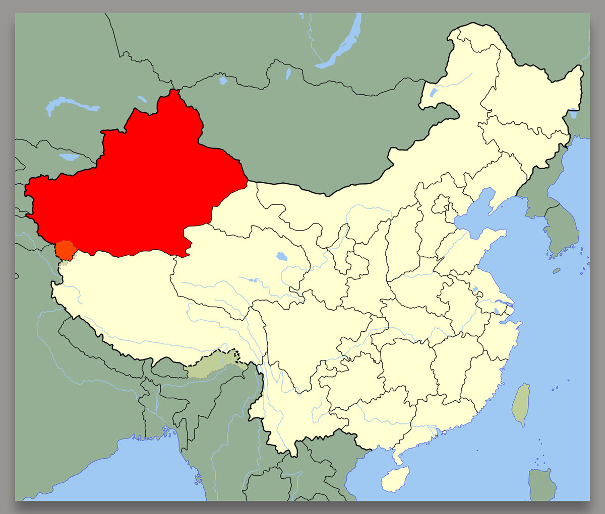 Рисунок 10. Выделенный красным Синьцзян-Уйгурский автономный район (СУАР) на современной карте Китайской Народной Республики.