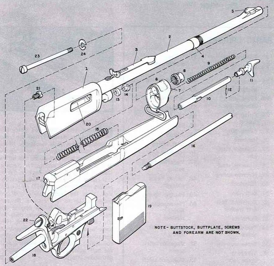 После нажатия фиксирующей кнопки, спереди-вверху за пенал выкручивается шток-шомпол, после чего карабин сам распадается на две части, как и оригинальный «Винчестер 1907».