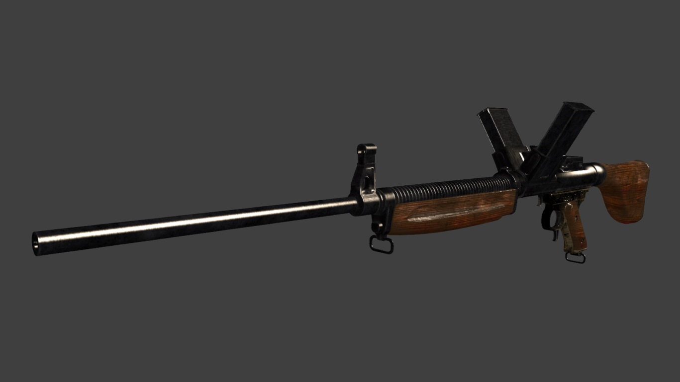 «Рогатым» сей пулемёт заокеанские остряки-самоучки назвали из-за довольно оригинальной системы питания: два стандартных коробчатых магазина на двадцать патронов – устанавливались сверху на ствольной коробке латинской буквой «V». Действительно, издали это кому-то (альтернативно одарённых в это мире хватает) может напоминать рога.