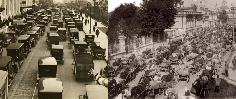 Рисунок 2. Два мира – две системы: пробки на улицах Нью-Йорка (слева) и Москвы (справа) в 20-х годах XX века.