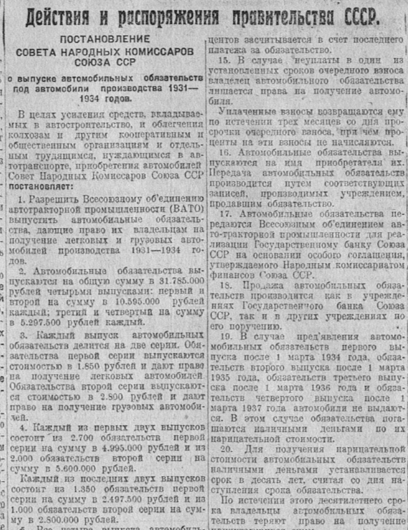 Рисунок 6. Газетная статья с постановлением Правительства «О выпуске автомобильных обязательств под автомобили производства 1931‑1934 г.». Наша АИ отличается от РИ тем, что в ней начало реализации обязательств, отодвинуто на 1941 год.