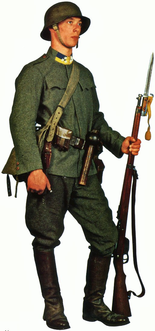 В конце-концов перепробовав множество вариантов обмундирования, выбрали из них самый удобный, за основу взяв униформу бойцов австро-венгерских штурмовых батальонов образца 1918-го года. Вместо традиционно одеваемой через голову гимнастёрки – двубортный китель с двумя нагрудными карманами и одним потайным. Псевдо-погончики чисто чтоб лямки амуниции и ремни оружия на плечи меньше давили, да сам китель на плечах не изнашивался, петлицы со знаками различия рода войск и воинского звания, потайные пуговицы.
