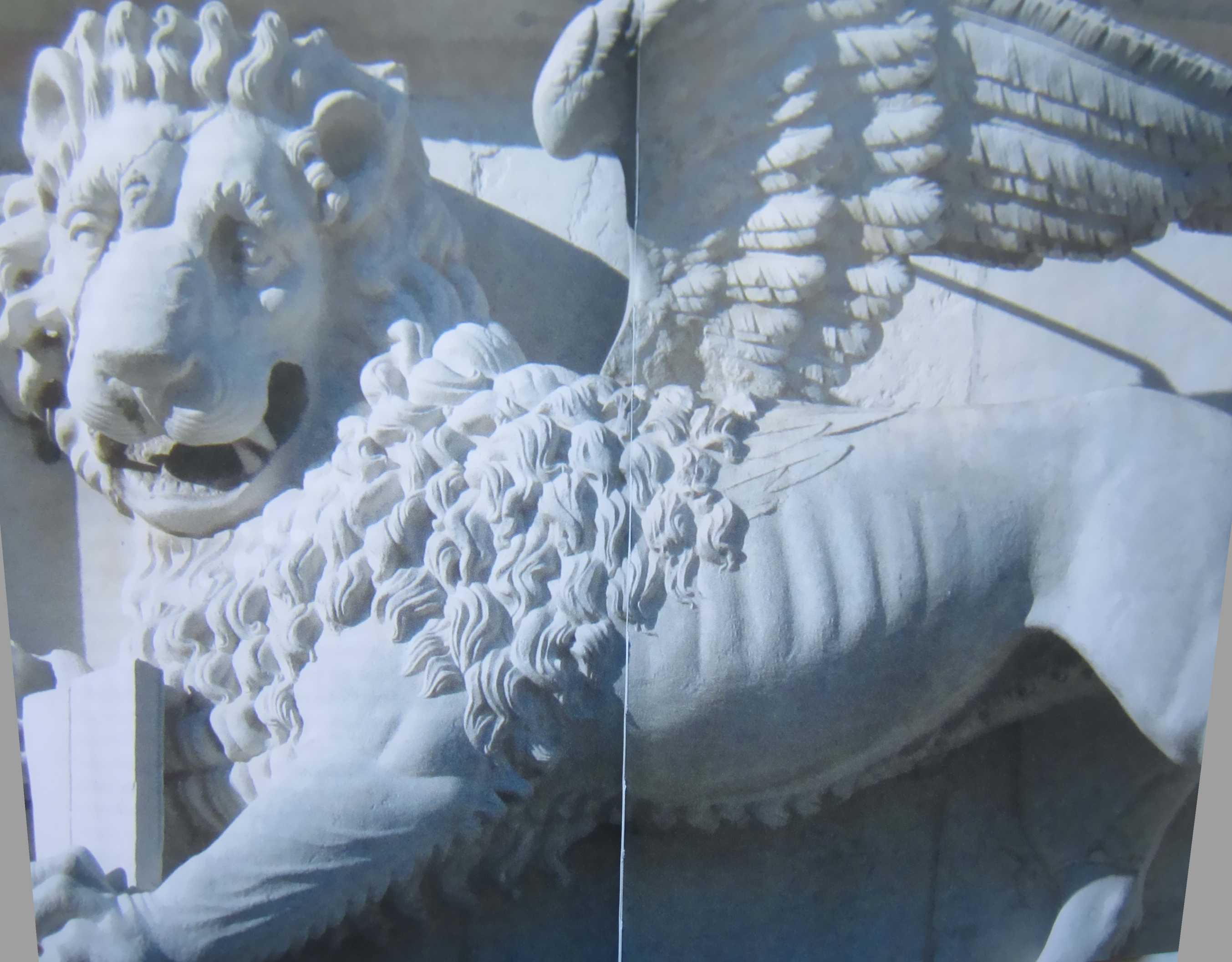 Никто лучше Карпаччо не изображал этого льва – вдали слева Дворец дожей, а справа несколько кораблей с надутыми парусами. Слева на переднем плане кусты, дерево, участок земли, почти незаметно переходящий в воду, с которой обручен город, и посредине лев с прозрачным кругом святого нимба вокруг свирепой царственной головы, за гривастой холкой – длинные крылья, отчего он вдруг становится и птицей. Он могуч и гибок, твердо стоит на земле, но властвует и водой, и воздухом над нею, хозяин всех стихий, из древности явившийся в Европу, мощная правая лапа с острыми когтями лежит на вертикально стоящей книге. Две страницы ее разворота ослепительно белы, текст на сияющей странице неизбежен: «Pax tibi, Маrcе, evangelista meus – Мир тебе, Марк, благовестник мой». Мифы могут все, могут позволить еврею – последователю распятого на кресте учителя написать книгу, что будет жить в веках, могут даровать льву, спутнику этого человека, крылья и силу защищать город, могут поместить этого льва высоко на столпе на городской площади, откуда он обозревает лагуну, вот так он там и стоит: лев над городом и водою.