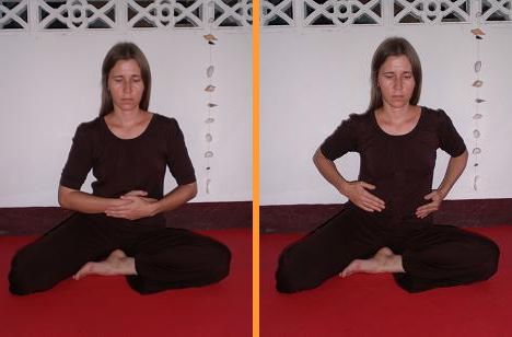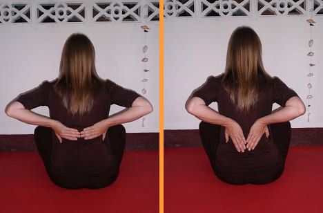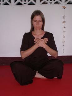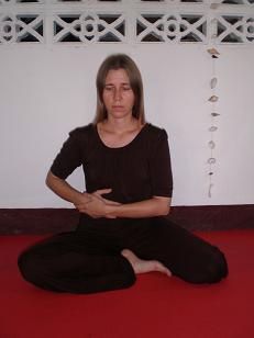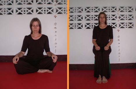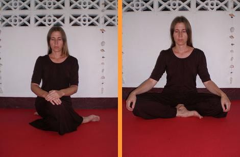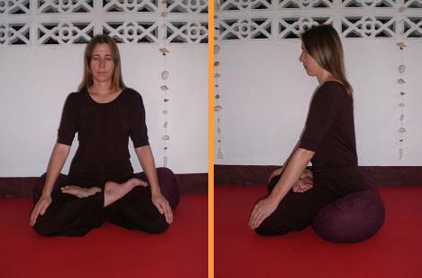 В положении сидя стопы, колени и бедра создают горизонтальную основу. Тазовая область находится чуть выше скрещенных ног, на тугой подушке или скамеечке. Живот должен быть расслаблен, а пространство в промежности свободно. В таком случае не нарушается циркуляция энергии в ногах и внизу тела. Позвоночник следует вытянуть вверх, как бы подвесив голову за макушку. Проведите внимание по позвоночнику снизу вверх. Проследите за открытостью области крестца и поясницы, расправьте зону между лопатками и натяните шейный отдел, слегка вжимая подбородок вовнутрь.